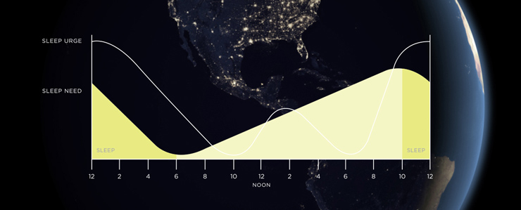 生理节律是一个 24 小时的循环,影响各种生物体,如人类、果蝇和真菌。 生理节律会在一天中的不同时间起伏。 对于成年人,最强的睡眠驱动因素通常发生在 2-4AM 之间,下午在 1-3PM 之间,但这取决于您是“早鸟”还是“夜猫”。 如果睡眠充分,那么我们在节律下降期间经历的嗜睡情况会变得不那么强烈,如果睡眠不足,则会更加强烈。 生理节律也让我们在一天中的某些时间点感到更加清醒,即使我们已经醒了几个小时,我们的睡眠/清醒平衡也会提醒我们睡意。