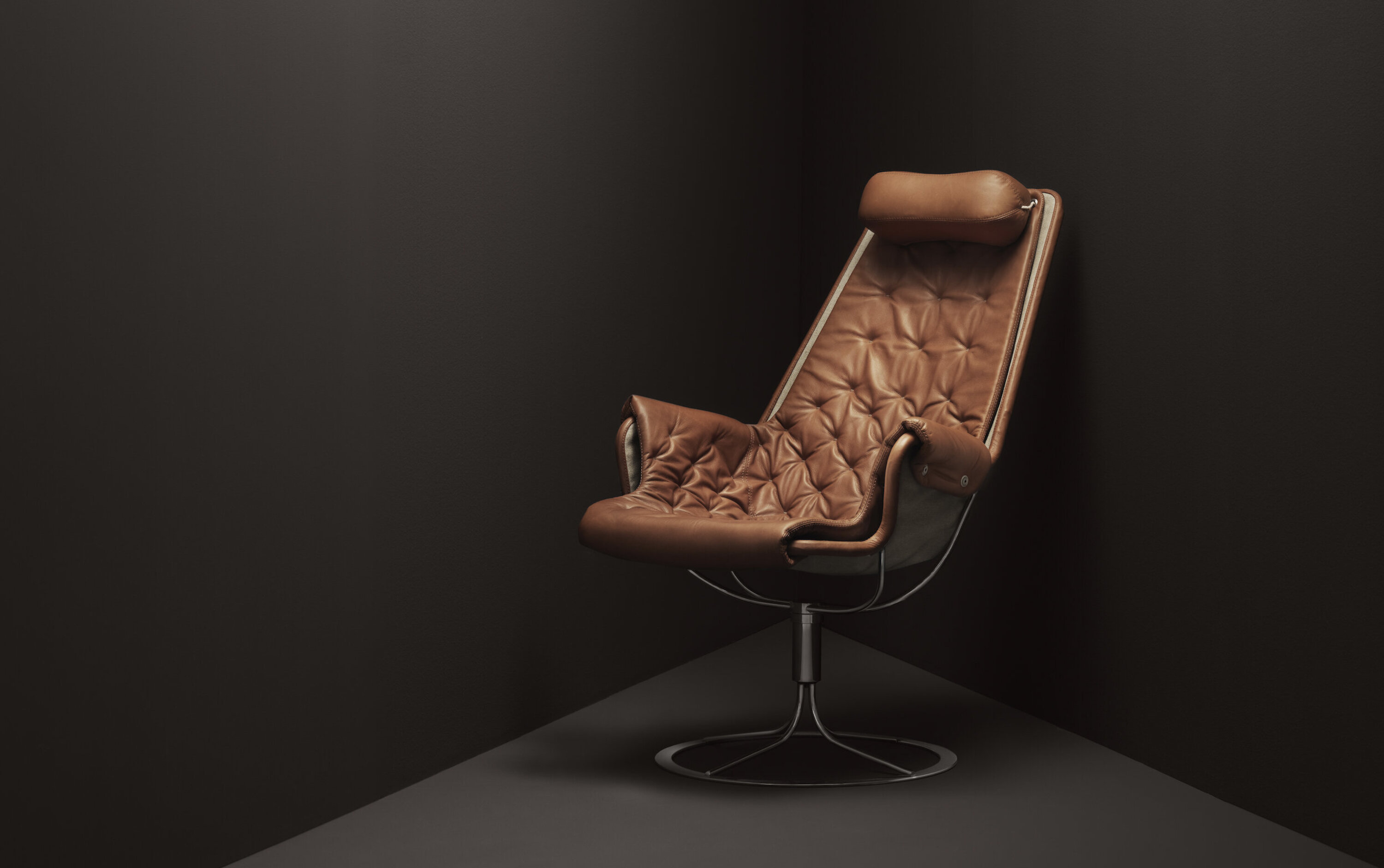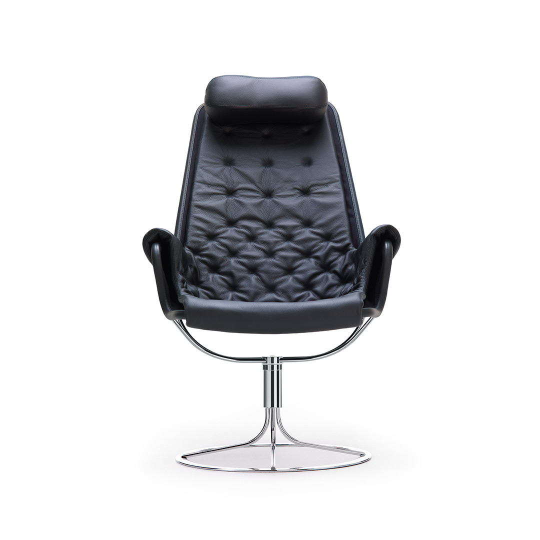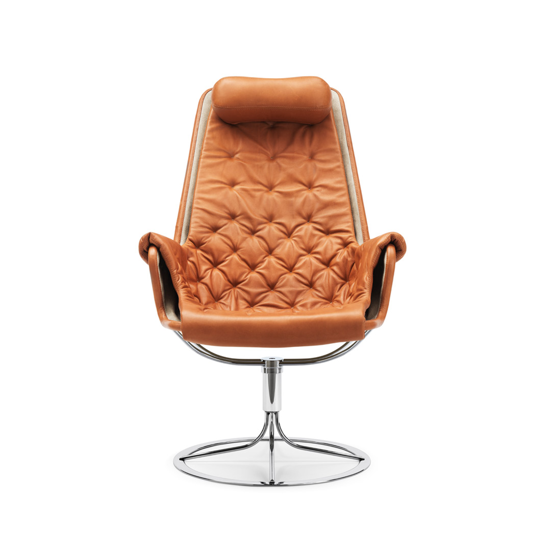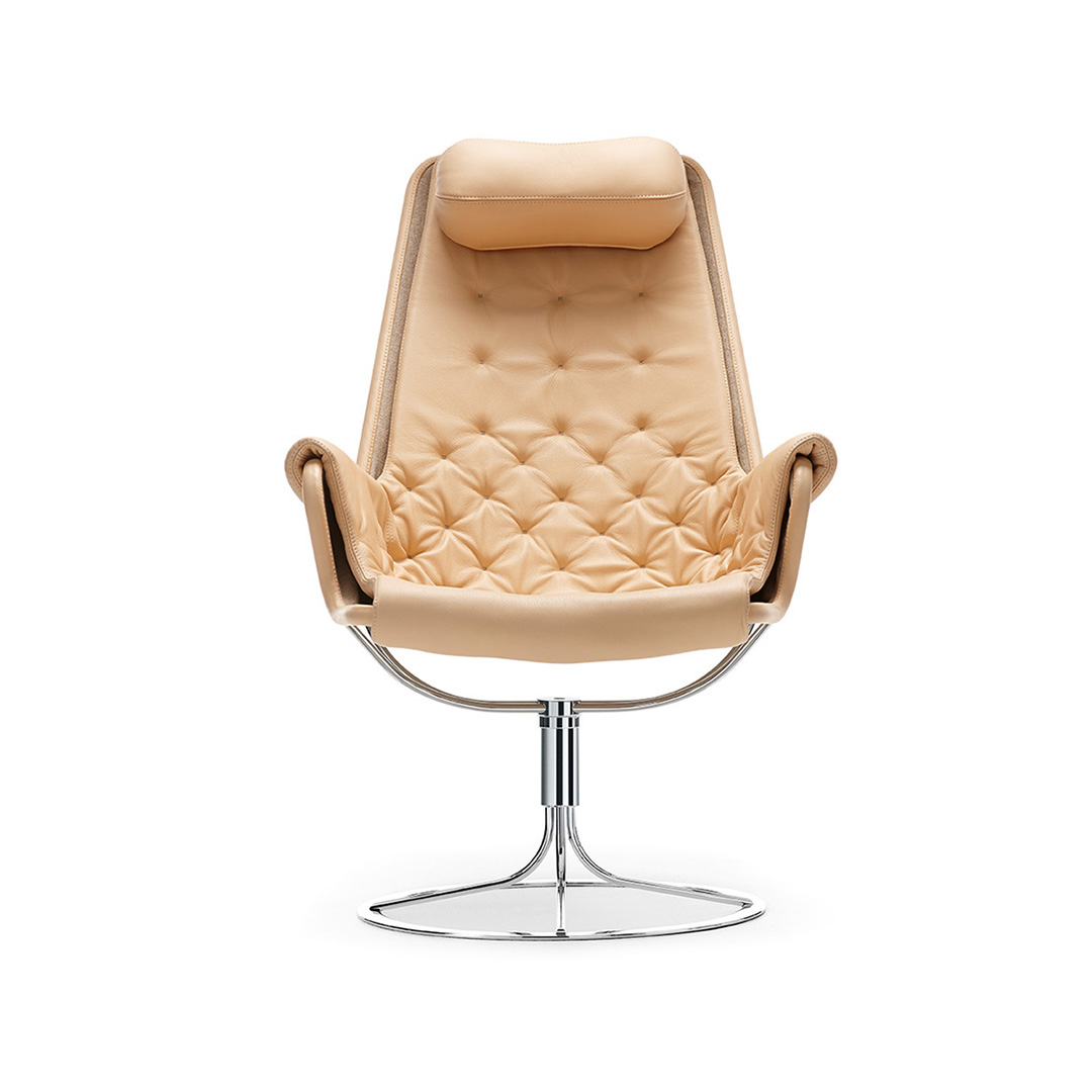 Bruno Mathsson 设计的标志型休闲椅。Jetson 椅子完美体现了他对舒适和经典的瑞典现代设计风格的痴迷。它采用碗形座椅,符合人体工程学设计的高背,带头枕。镀铬旋转底座配有独特的自返回机构。