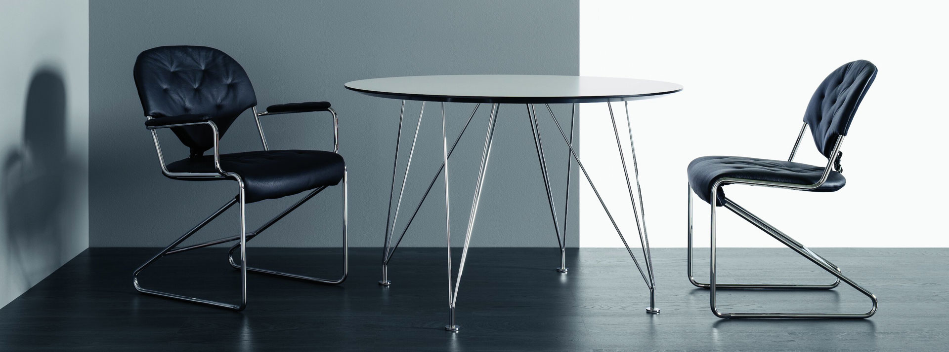 圆形咖啡桌鼓励与所有客人进行对话和眼神交流。 亦可作为餐桌或带有两个可伸缩部分的餐桌使用。