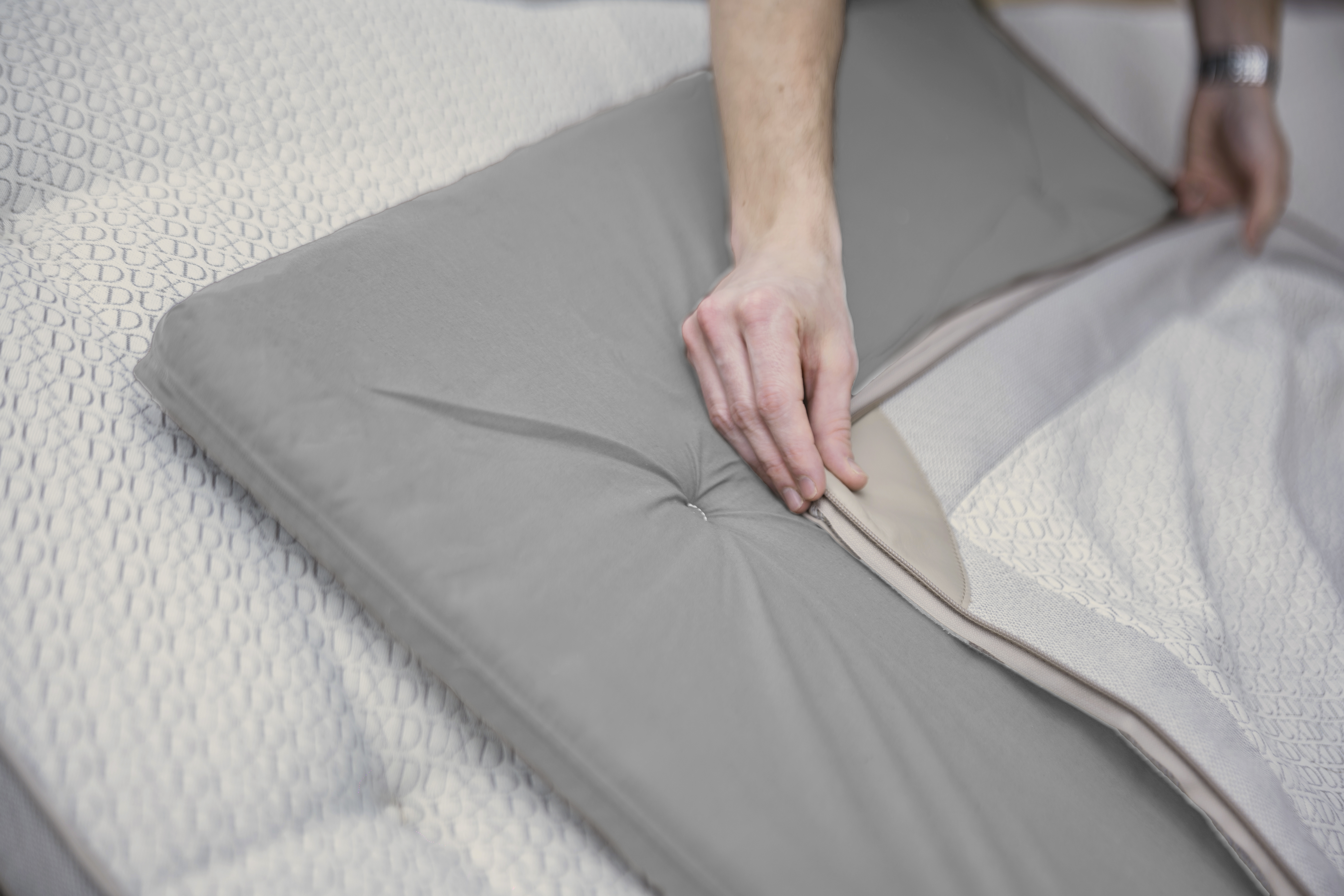 DUX 床由可定制的组件组成。 每个组件都可更换,有些甚至可以升级。 我们的床褥没有固定在床上,因此更加灵活。 可以在床垫上方拉开拉链,以便够到 Pascal 可定制的支撑系统,并且双弹簧基座可以相互独立提供支撑。 如此一来,床出现磨损迹象时,不但能进行更换使其焕然一新,而且还能通过新推出的配件和技术创新,进一步提升。